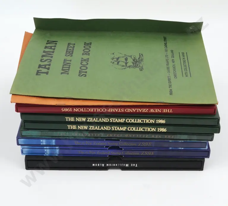 Seven New Zealand Stamp Collection Stamp Albums - including 2 x 1998, 2 x 1986, 1982, 1985 & The Millenium Album