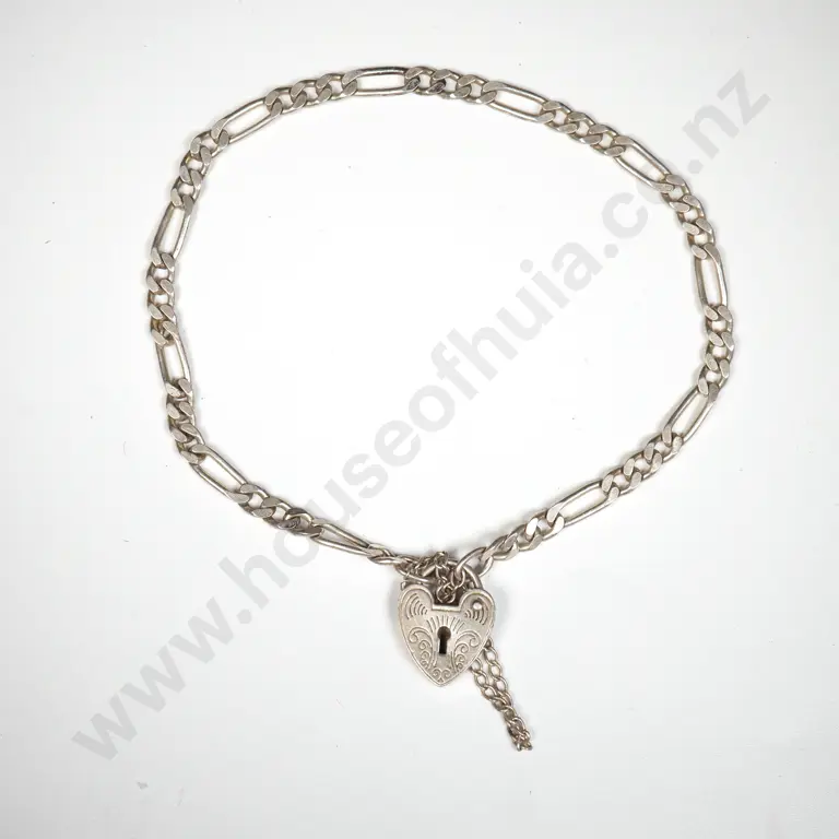 Sterling Silver Figaro Link Bracelet w Heart Locket