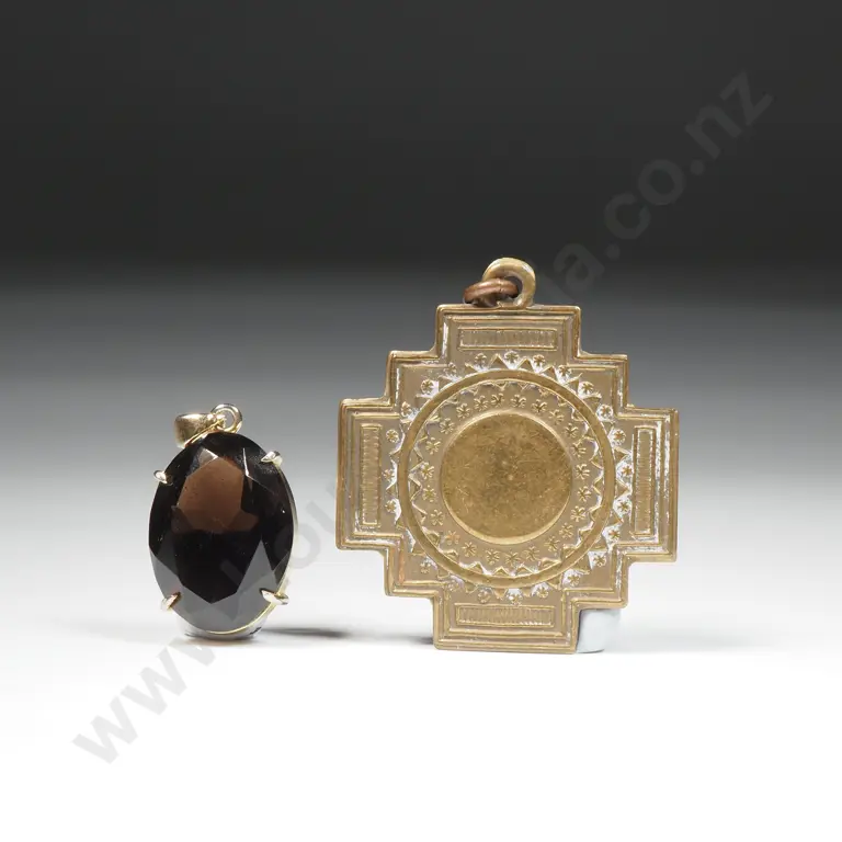 Brass Medallion, Facetted Stone Pendant w Gold Plate Frame