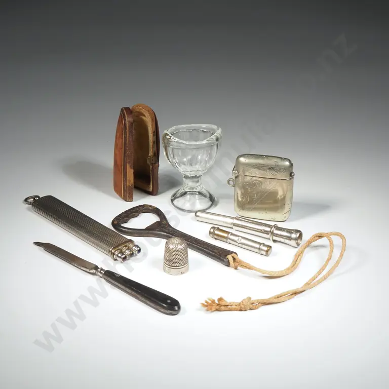 Bottle Opener, Thimble, Glass Eye Bath, Pocket Pen Holder, Vesta & Nail File