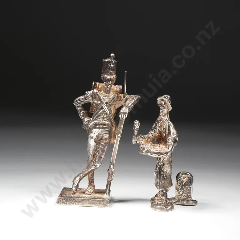 Two Figurines: A Silver Toy Solder & a Street Seller w Milestone
