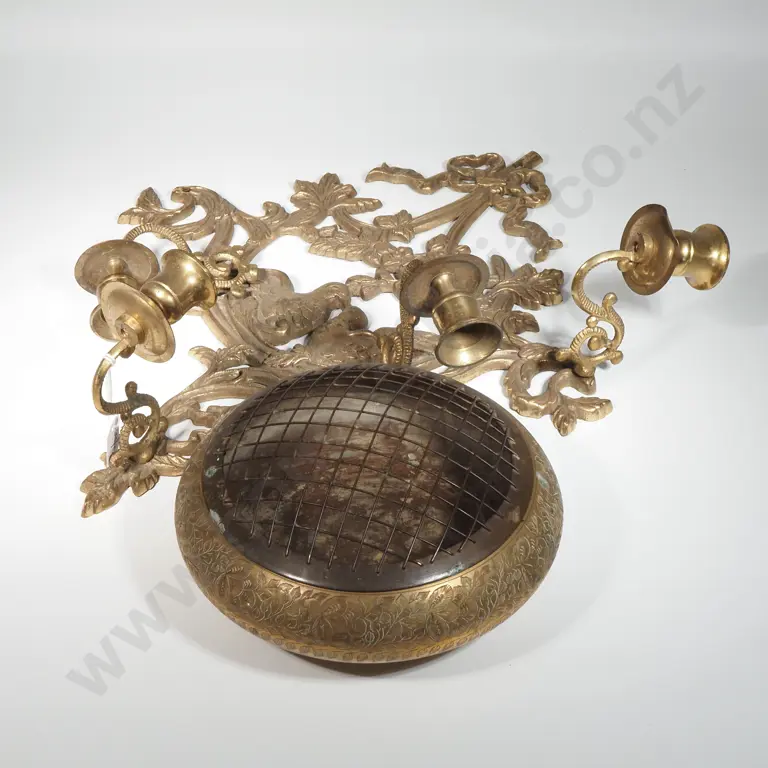 Three Branch Candelabra, Three Small Brass Elephants, Three Brass Vases, Art Nouveau Style Plate, A Rhythm Quartz Clock