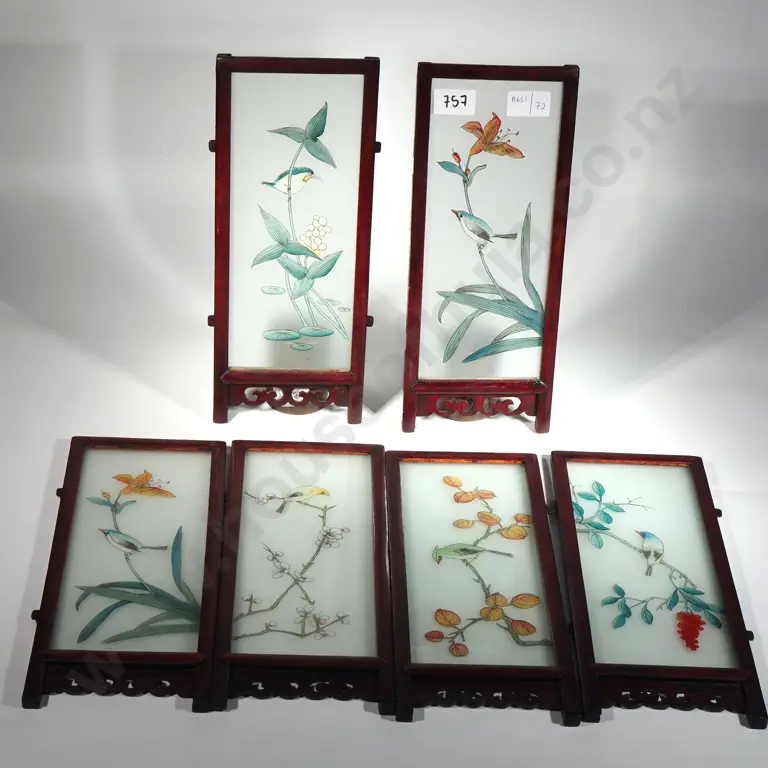 Japanese Six Panel Glass Table Screen With Images Of Birds On Flowers