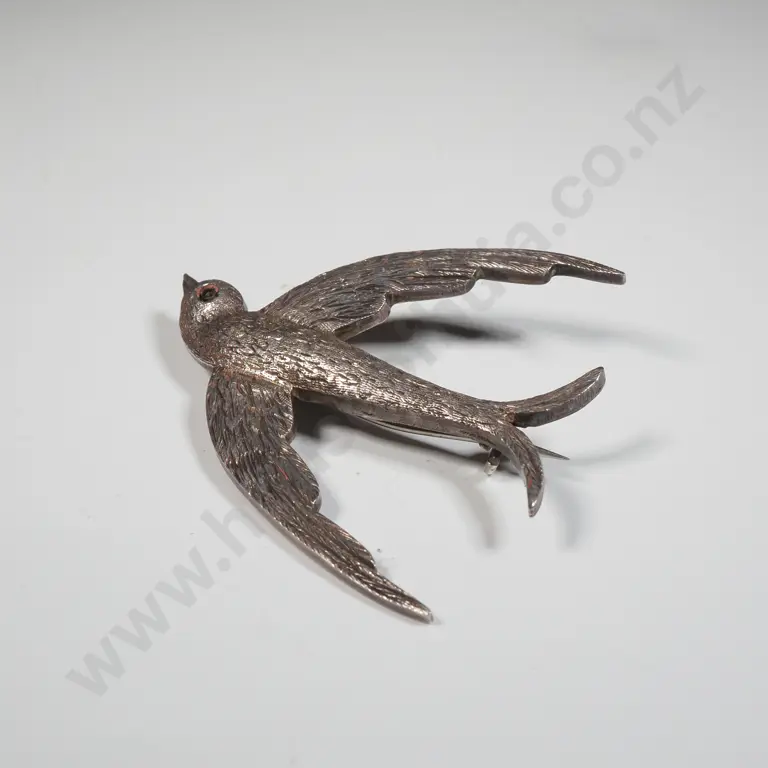 Sterling Silver Soaring Swallow Brooch With Finely Engraved Detail & Marcasite Eye