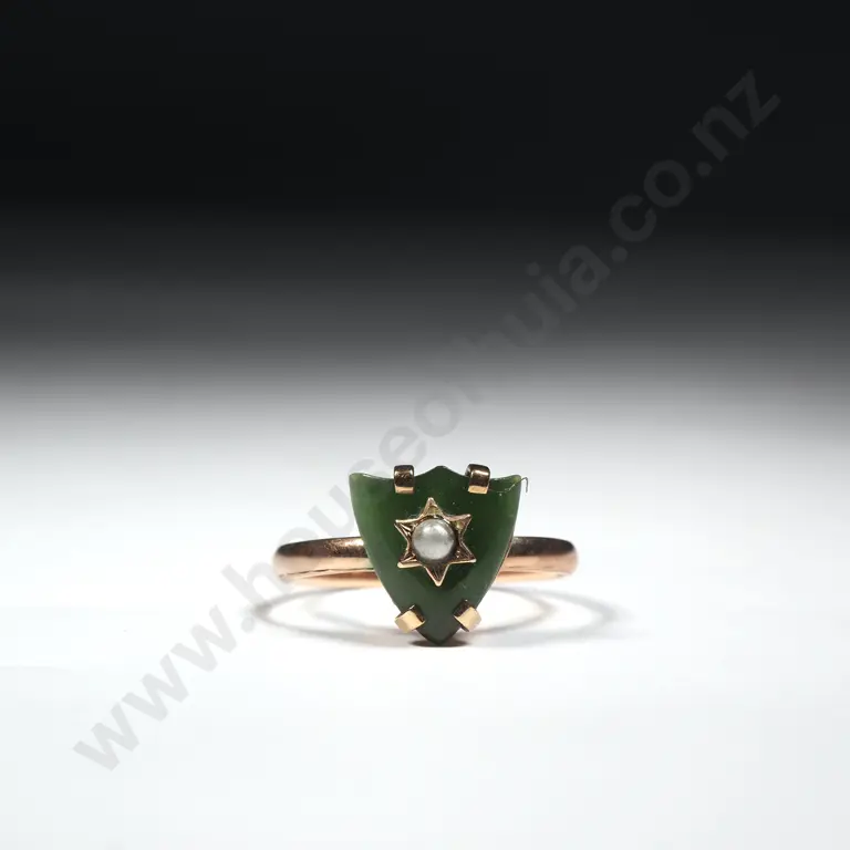 9ct Shield Shaped Greenstone Ring w Central Seed Pearl In Original Art Deco Ivorex Box