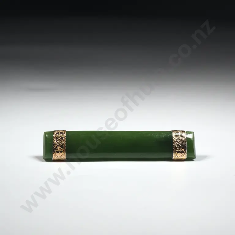Greenstone Bar Brooch with Engraved 9ct Gold Mounts