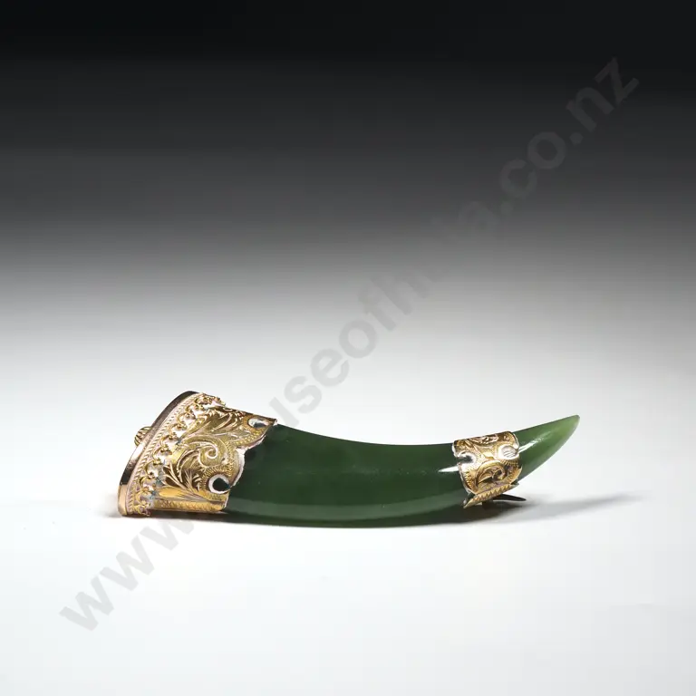 9ct Gold & Greenstone Cornucopia Shaped Brooch w Engraved Mounts
