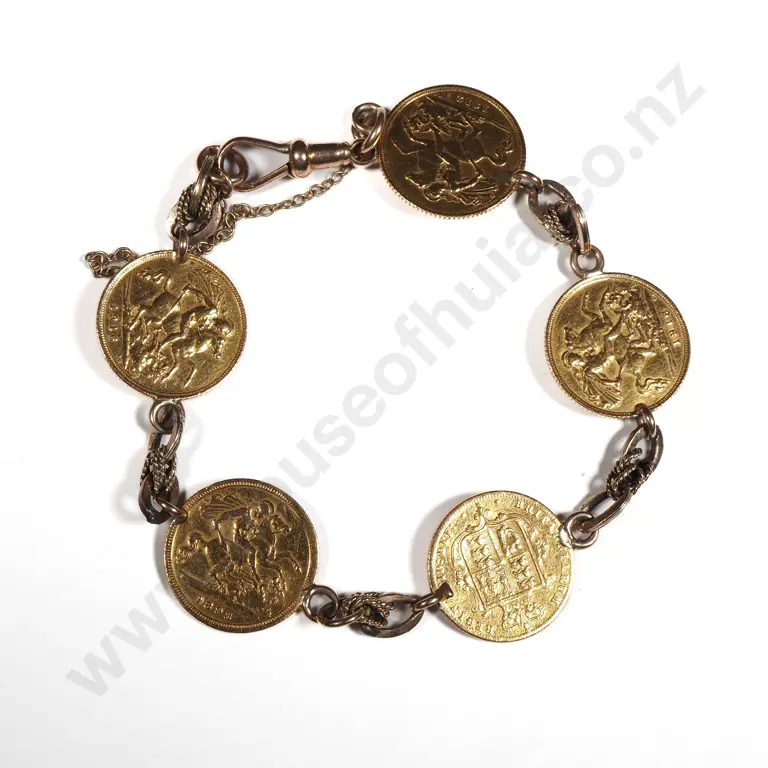 Antique 9ct Gold 5 Half Sovereign Bracelet w Dog Clip