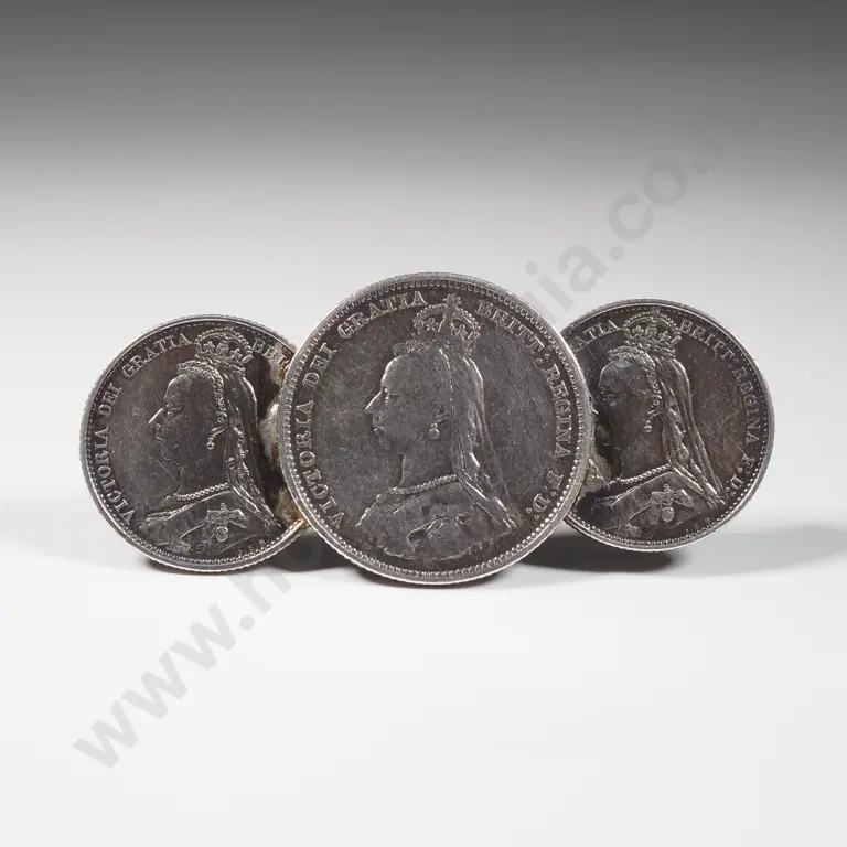 Silver Three Coin Brooch Featuring A Victorian Head Shilling & Two Sixpences Overlapping 1887