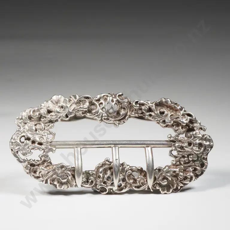 Late Victorian Sterling Silver Belt Buckle with An Ornate, Pierced & Molded Design of Flowers & Swirling Foliage