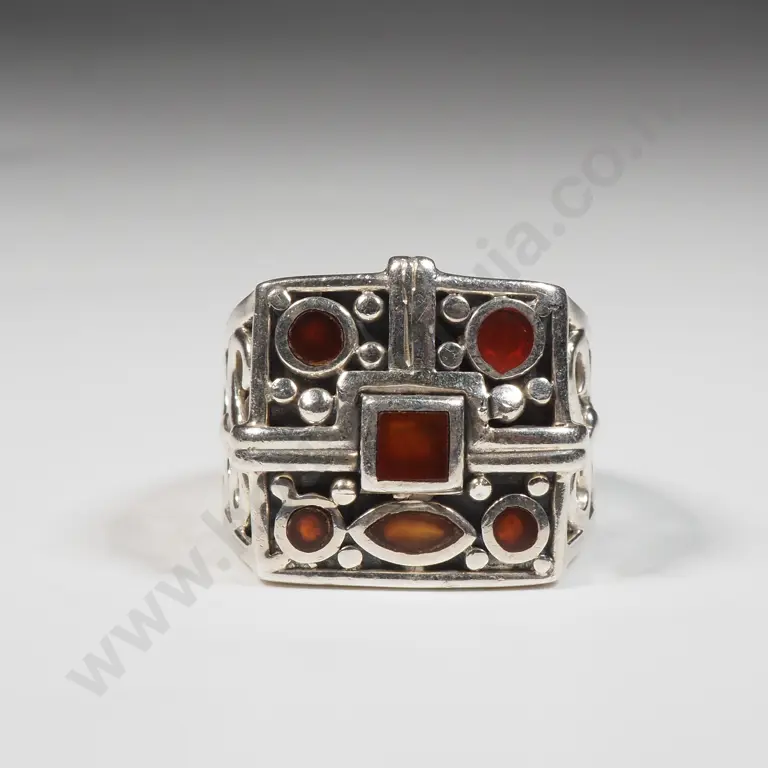 Square Sterling Silver Ring Set With Five Orange Gemstones. Weight 10.7 grams