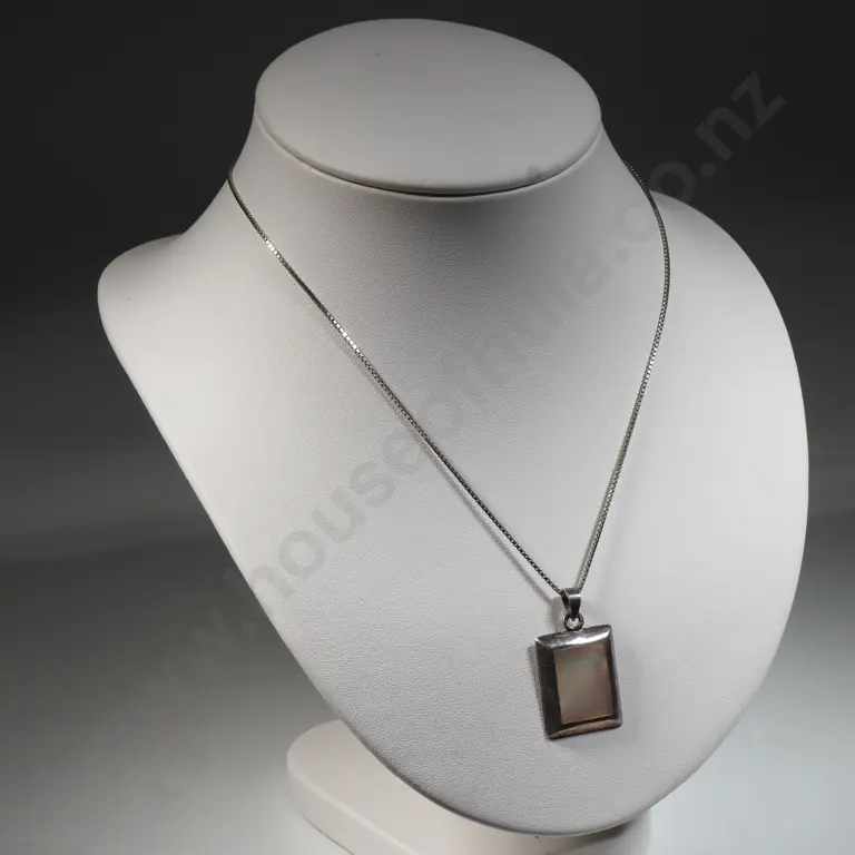 Sterling Silver Oblong & Mother Of Pearl Pendant On Box Link Chain