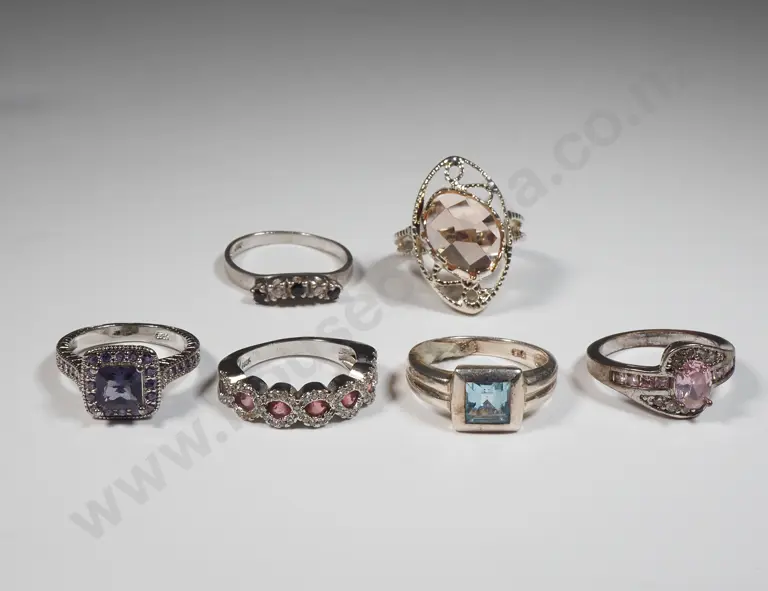 Six Sterling Silver & Coloured Stone Rings