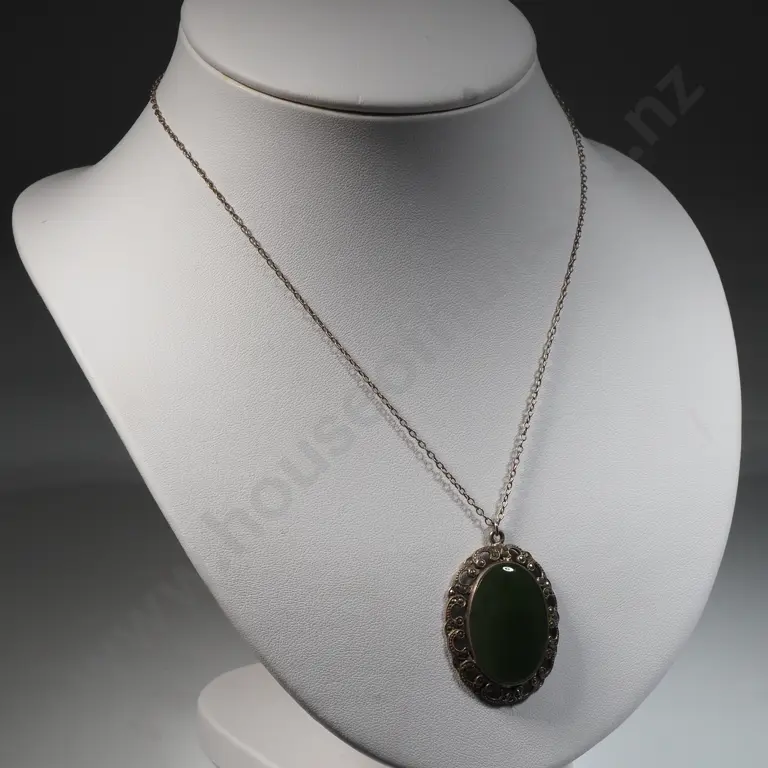 Sterling Silver & Oval Greenstone Pendant & Chain