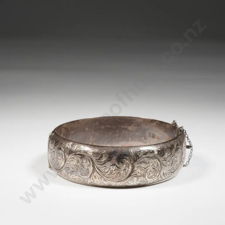 Sterling Silver Hinged Bracelet With Scroll Decoration. Chester Assay Marks