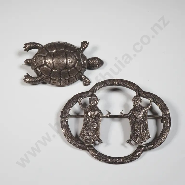 Two Sterling Silver Brooches. One Siam Silver Quatrefoil Shaped With Thai Dancer; the Other In The Form Of A Turtle