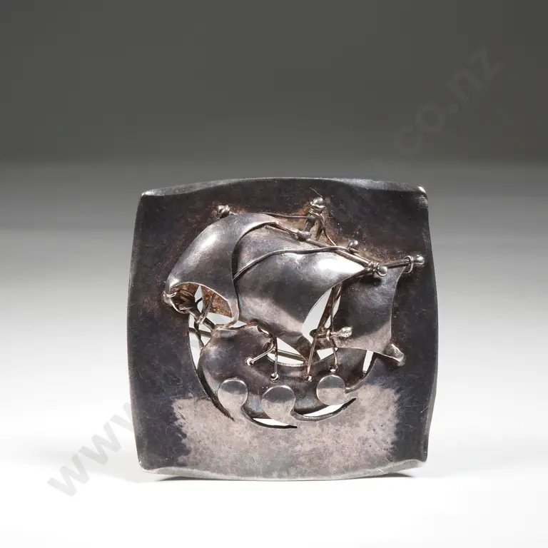Large Sterling Silver Arts & Crafts Square Form Brooch Featuring A Sailing Ship