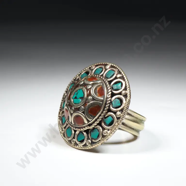 Ethinic Silver Toned Turquoise & Coral Ring.