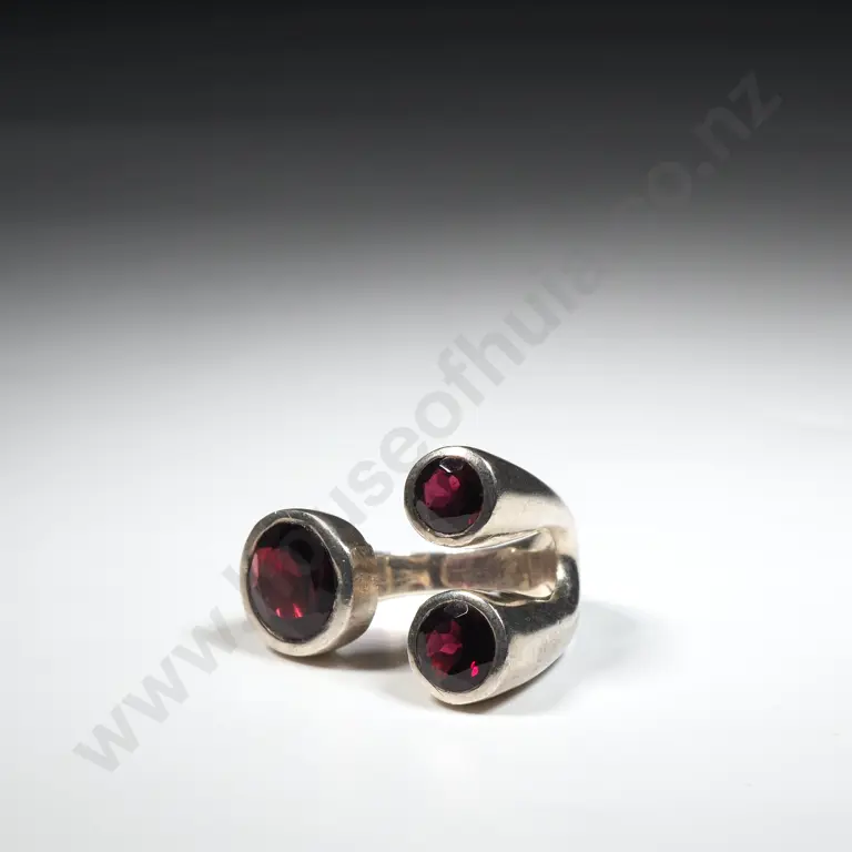 Sterling Silver Three Stone Modernist Ring Set with Red Stones