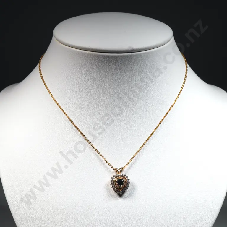 Gold Tone Crystal/Black Gem Style Heart Shaped Pendant w Gold Tone Chain.