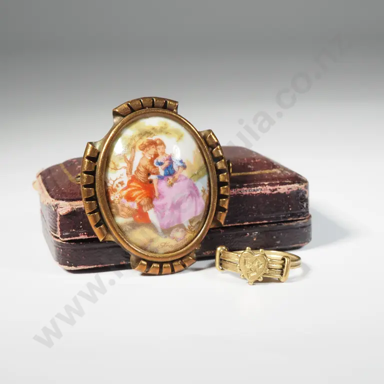 Vintage LImoges Oval Brooch With Brass Frame & A Isle Of Manx (Three Legs) Brass Ring In Vintage Leather Box