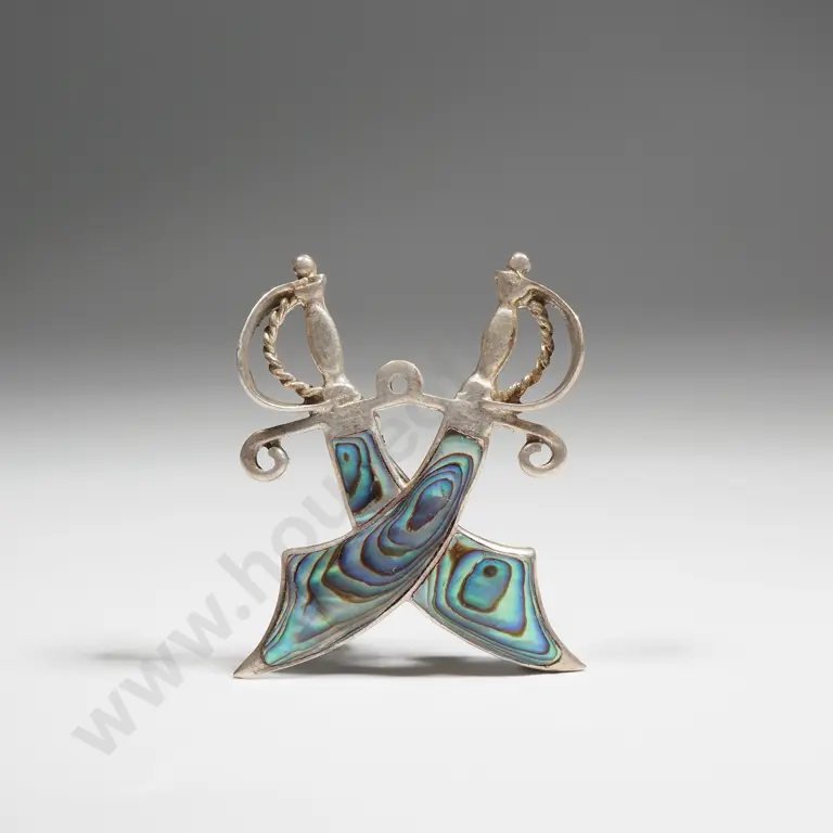 Vintage Sterling Silver & Paua Shell Brooch Depicting Crossed Scimitars