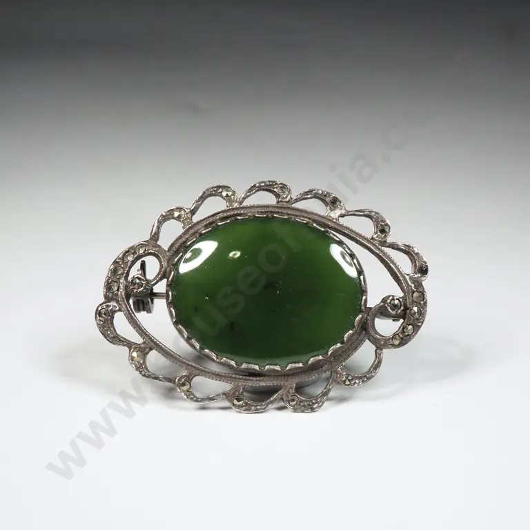 Greenstone Oval Brooch w Ornate Marcasite Mount