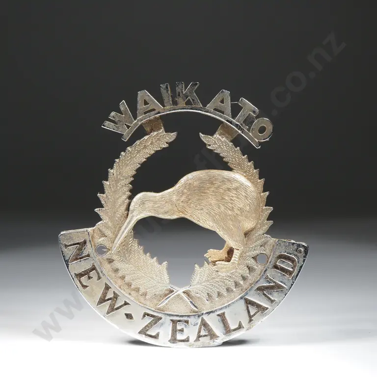 Car Grill Badge w Kiwi, Fern Leaves & 'Waikato New Zealand'