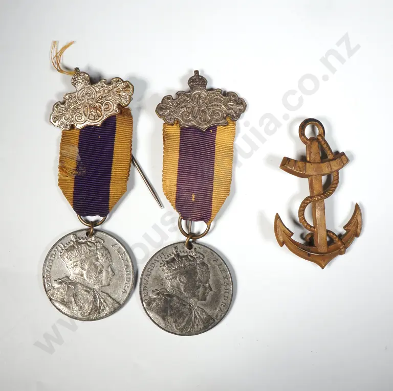 Two 1902 Coronation Pins & Naval Anchor Cap Badge - Pin Removed