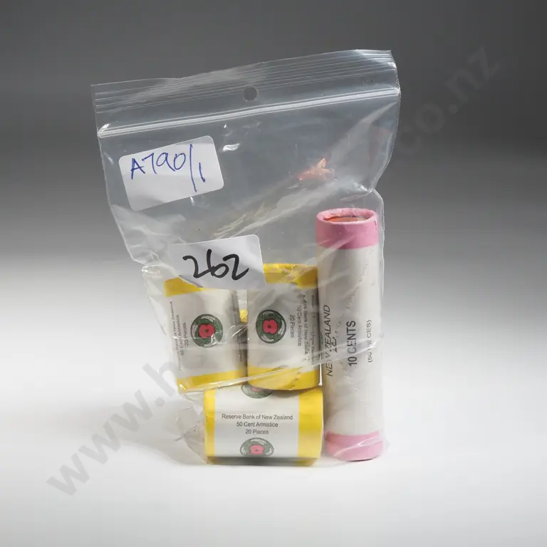 Four 2018 Armistice Rolls of Fifty Cent Coins & Roll of 50 Ten Cent Coins