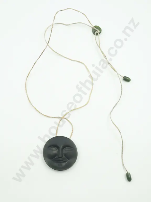 Greenstone Moon Face Pendant on Flax Cord w Greenstone Fastenings Estimate: $100 - $140