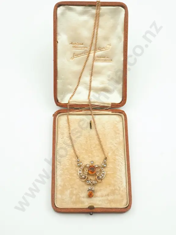 Edwardian Citrine & Seed Pearl Pendant & Chain in Box Estimate: $350 - $450