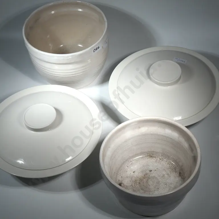 Lot of Two Covered Tureens & Two White Ribbed Pottery Planters/Jardinieres