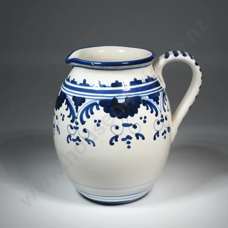 Pottery Jug/Pitcher w White Ribbed Crackle Glaze Body & Green Accents