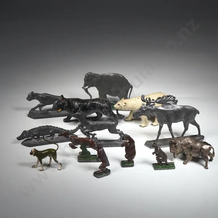 Ten Britains Vintage Painted Hollow-Cast Lead Dogs, a Cat, a Rabbit & Two Kennels