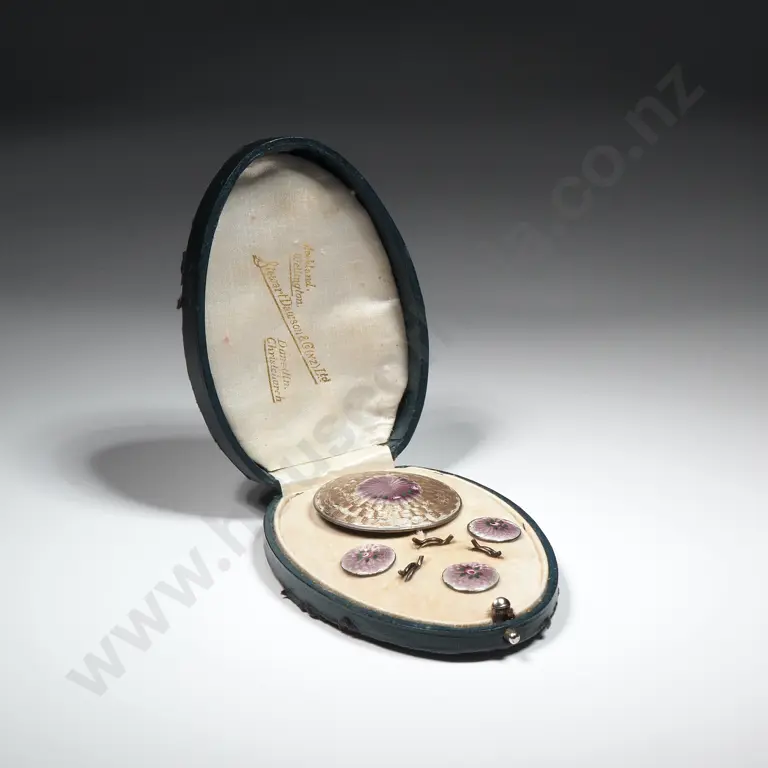 Antique Sterling Silver Machine Turned Enamel Brooch Button Set