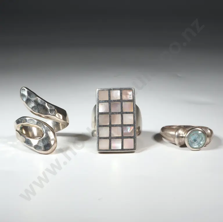 Three Sterling Rings - One w Pale Blue Stone & one w Mother of Pearl Estimate: $50 - $100