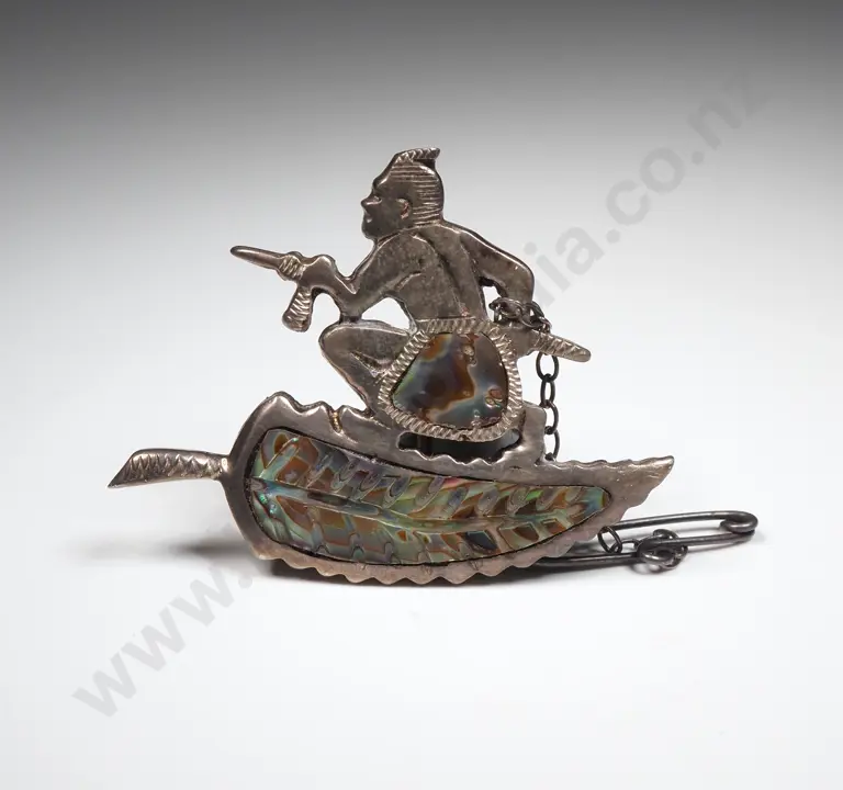 Vintage Sterling Silver & Paua Shell Brooch - Maori Warrior on a Fern