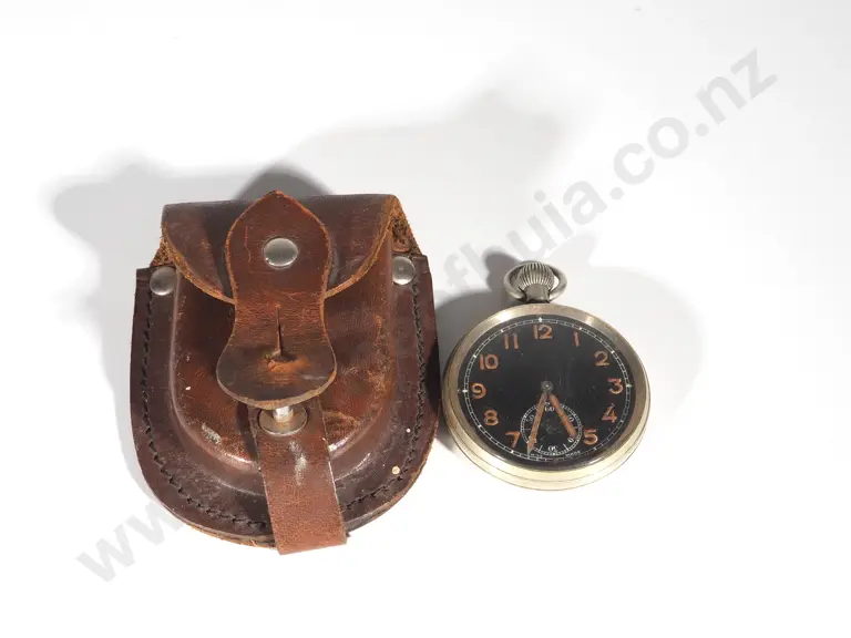 WWII G.S.T.P Broad Arrow Black Face Pocket Watch w Leather Case Estimate: $80 - $120