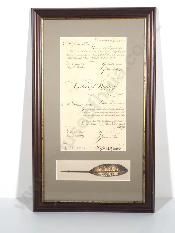 Framed Antique Document & Silver Quill: Dated 1800 for the sum of 106 Pounds Estimate: $200 - $300