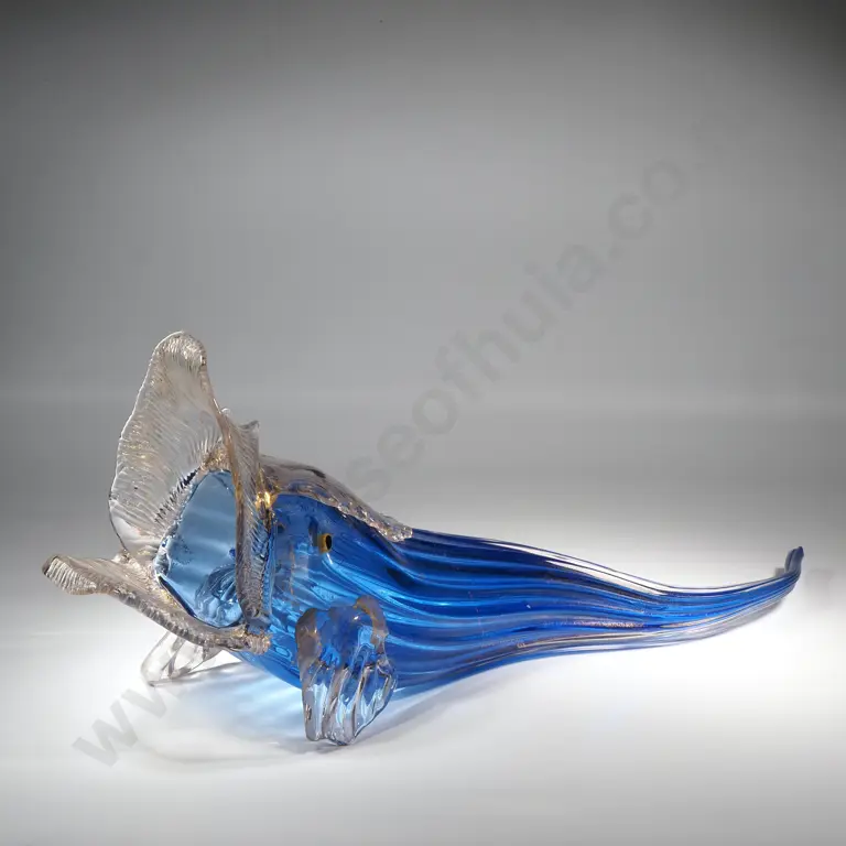 Large Blue & Clear Open Mouthed Glass Fish w Gilt Enhancements (Avventurina)