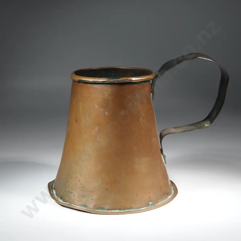Early Rustic Copper Tankard w Scrolled Handle & Flared Base