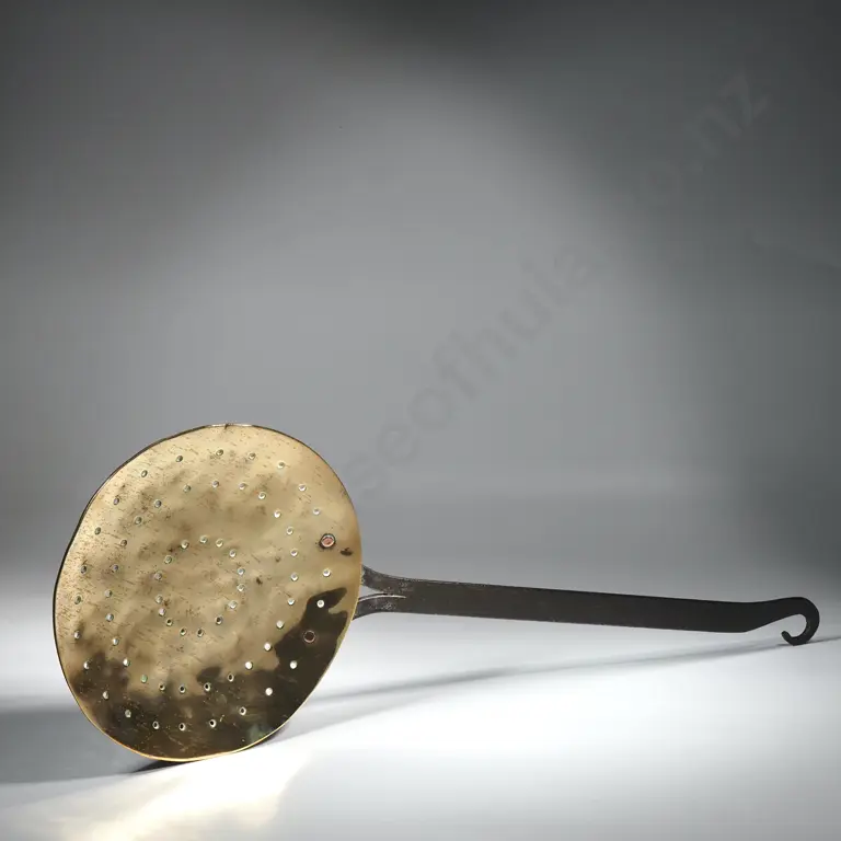 Antique English Victorian Brass Cream Skimmer w Wrought Iron Handle