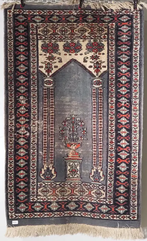 Hand-Knotted Prayer Rug in Terracotta, Grey Blue, Mint Green & Cream Tones