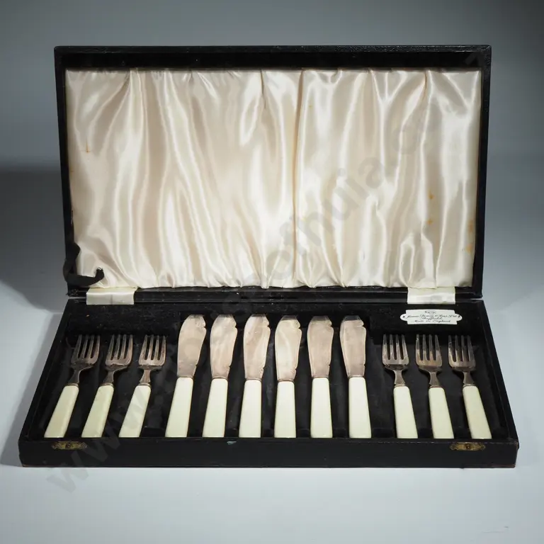 Boxed Silver Plate Fish Knives & Forks w Bone Handles