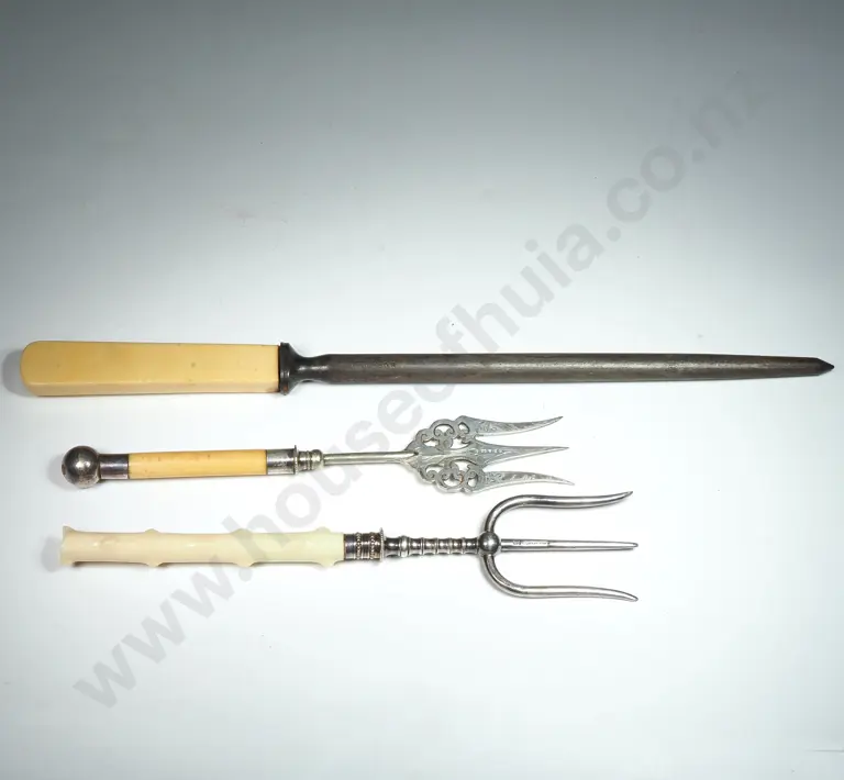 Two Antique Bread Forks, & a Bone Handled Knife Sharpening Steel.