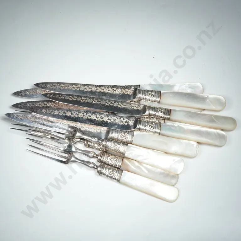 Set of Six Mother of Pearl & Silver Plate Dessert Knives & Forks