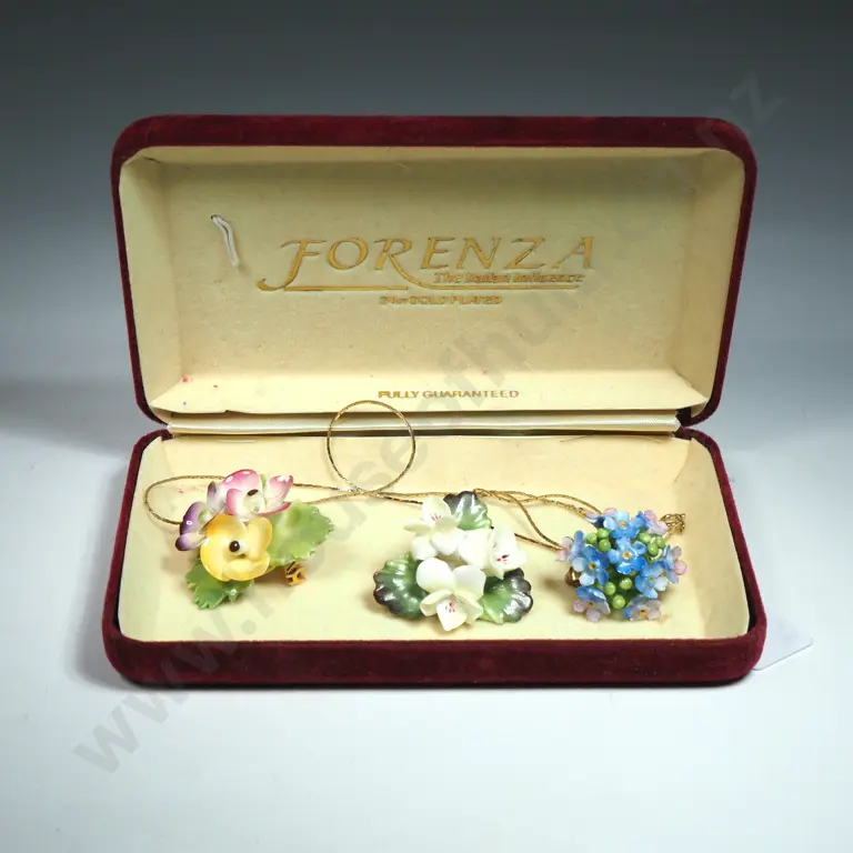 Three Cara China Floral Brooches & A Gold Plate Necklace