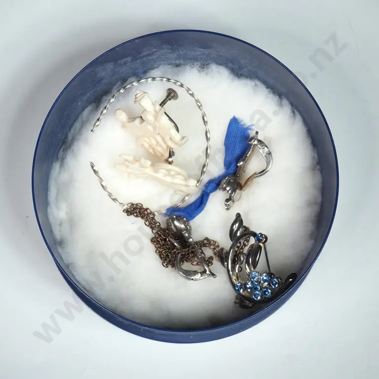 Costume Jewellery including Bone Earring in the Form of Richshaws, Sterling Silver & Marcasite Earrings & A Brooch