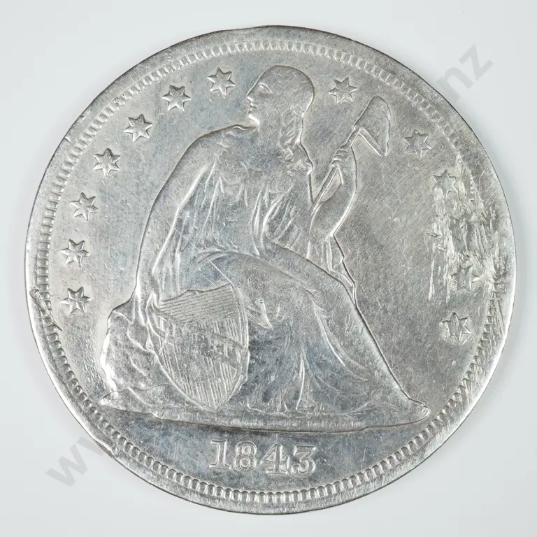 Seated Liberty & Trade Dollar: 1843 Seated Liberty - Cleaned With Marks And Filled Piercing Else Extremely Fine